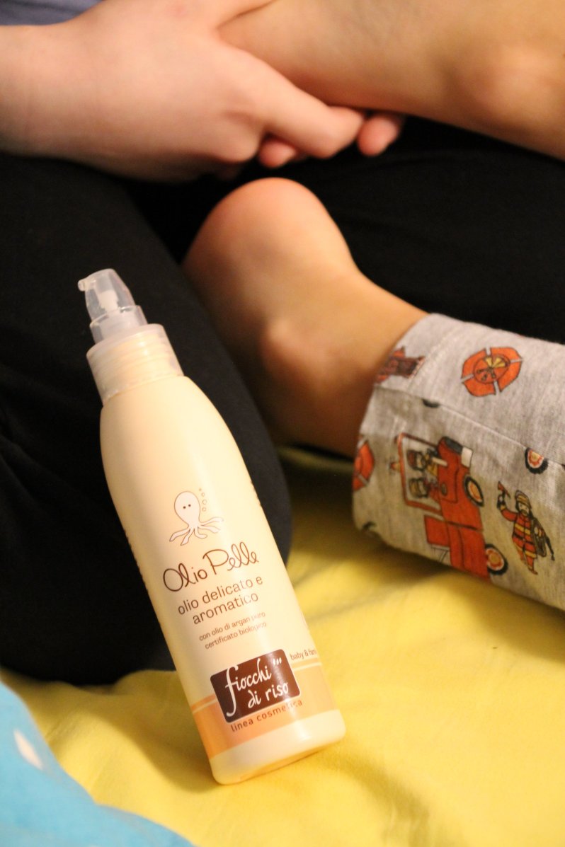 Se è una pratica che pensate possa piacere a voi e al vostro bambino o bambina, non dovete far altro che procurarvi un buon olio (va benissimo quello di mandorle spremute a freddo oppure noi vi consigliamo l’olio pelle della fiocchi di riso. Ha un profumo delicatissimo che rimane a lungo sulla pelle e per me è fondamentale il fatto che idrati senza però ungere. Vi confesso che lo uso anche per la mia pelle super secca!!!), musica rilassante se gradite, un posto comodo e soprattutto un po’ di tempo senza dover pensare a nient’altro!